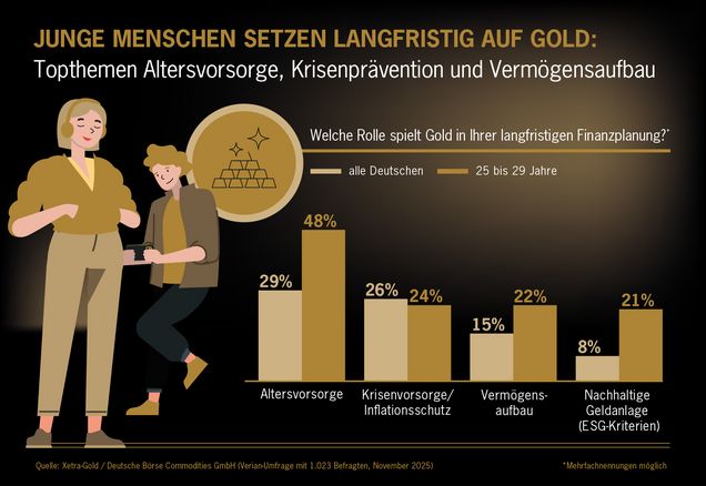 Im Auftrag der Deutsche Börse Commodities GmbH hat das Meinungsforschungsinstitut Verian (vorher Kantar Public) eine repräsentative Stichprobe von 1.023 Personen in Deutschland befragt. Die Befragung wurde im Zeitraum vom 20. bis 28. November 2025 durchgeführt.