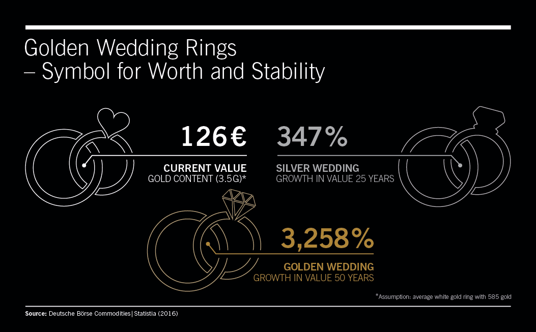 Gold has risen in value by 347 percent over the past 25 years – the number of years reached for a silver wedding anniversary. And couples celebrating their golden wedding anniversary this year will have seen a 3,258 percent increase in the value of their wedding rings. Nevertheless, rings are not suitable as an investment instrument and should remain a piece of symbolic jewellery on the fingers of their owners.