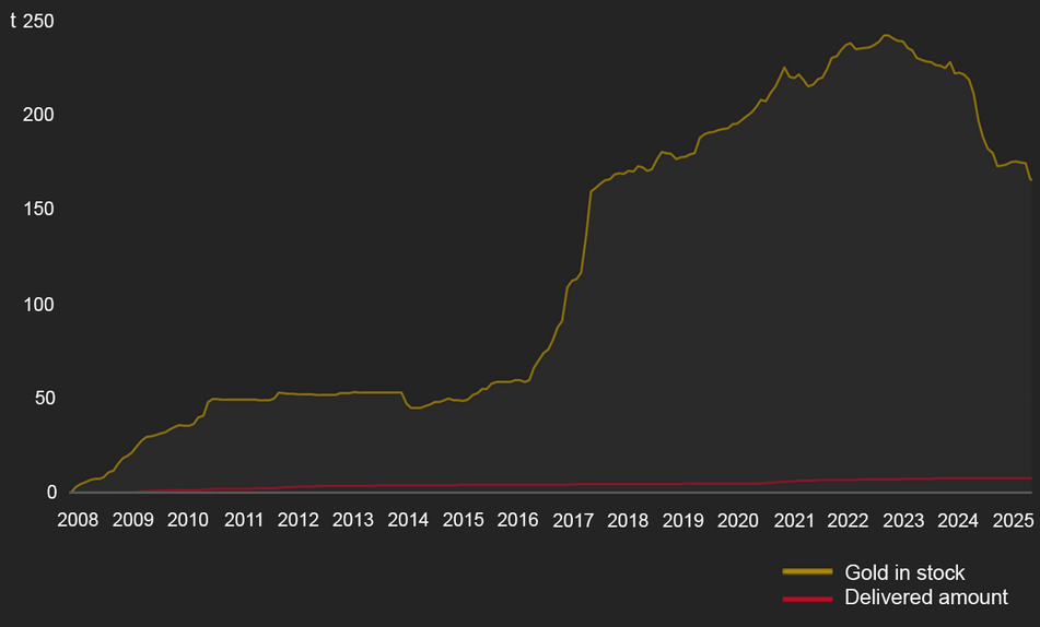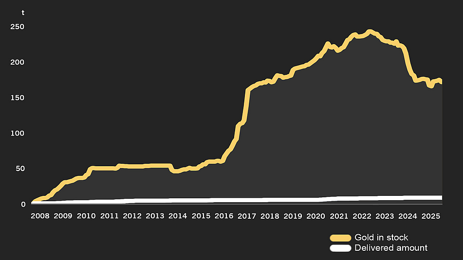 The holdings of Xetra-Gold amount to about 180 tonnes of gold. At the same time, the number of deliveries of physical gold has risen to more than 2,000, at a total volume of over 8 tonnes.