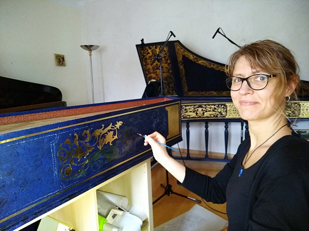 While searching for a specialist to commission with the gilding of their harpsichord, the Grychtoliks came across Berlin-based Jessica Zappe, who runs one of the few studios for harpsichord decoration in Europe. If there is anything like a typical career path for a harpsichord gilder, then Jessica Zappe has certainly did not followed it. She started out studying physics and maths to become a teacher before turning her hobby into a profession. As a lover of harpsichords and baroque music, she acquired the necessary specialist knowledge on her own. This was not an easy feat: she studied history books to learn about the colouring and ornamentation of harpsichords of the baroque style and experimented with various materials and working methods. Throughout her learning experience, she was supported by her global network of harpsichord players, gilders and lovers of the instrument, style and music. After a number of smaller jobs, she was able to open her studio in 2008. She has since become a sought-after specialist for harpsichord gilding and is commissioned by clients from across the world, private owners of instruments well as universities located as far away as Melbourne and Michigan.