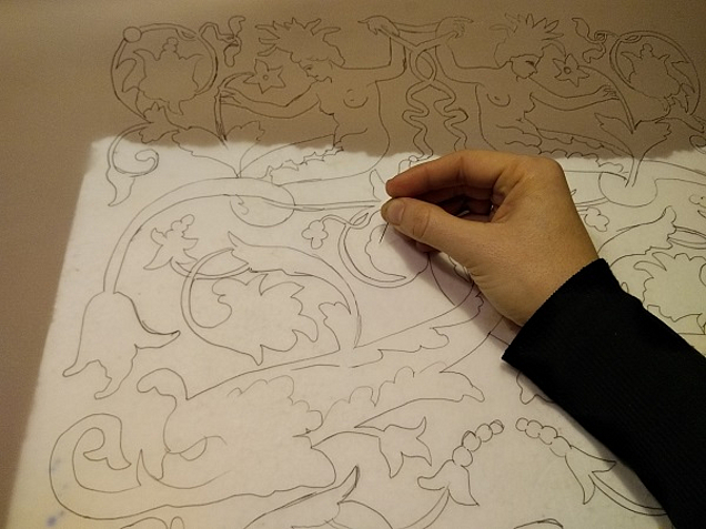 As a first step in the gilding of an instrument, Zappe draws the original-scale pattern of the ornaments on parchment paper, thus creating a blueprint for the gold decoration of the harpsichord. The contours of the parchment paper blueprint are then carefully punctured with a needle until the entire drawing is perforated.