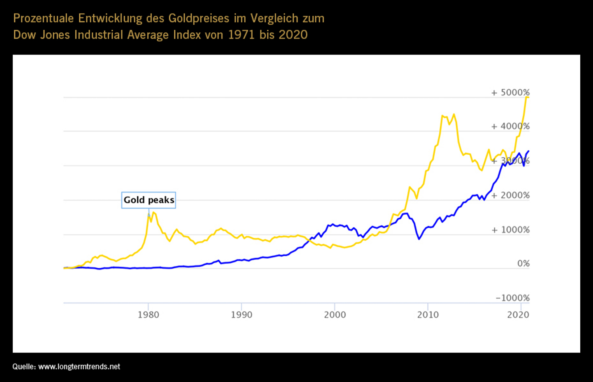 Auch ein direkter Vergleich der Entwicklung des Goldpreises mit einem der wichtigsten Aktienindizes, dem US-amerikanischen Dow Jones Industrial Average Index (DJIA), belegt, dass sich die Beimischung von Gold im Portfolio durchaus lohnen kann: Seit der Unabhängigkeit des Goldpreises vom US-Dollar 1971 bis zum November 2020 hat dieser um mehr als 5.000 Prozent zugelegt, während der DJIA Index nur um gut 3.400 Prozent gewachsen ist.